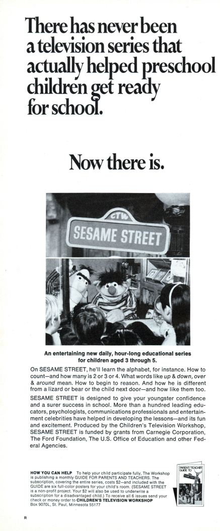 The initial task of the Utilization Department was simply to raise awareness of the launch of the show, and encourage people to tune in. CTW knew that parents in poor inner-city neighbourhoods were less inclined to watch public television channels, and might need help in locating the broadcasts on their dials. Most unusually, mainstream channels like NBC and CBS lent support to this promotional effort, running a pilot and spot announcements.[ii] Following Davis’s appointment, a few weeks before the first screening, teams of volunteers were sent out to distribute leaflets, convene meetings of parents and teachers, and take mobile trucks with promotional films into poor neighbourhoods. People were trained in how to tune in to UHF stations, as well as being informed about the show’s educational aims. Although Sesame Street was not intended for use in schools, publicity was also sought through networks of parent-teacher associations, and in presentations to staff in Head Start centres. Jimmy Booker, an African-American PR consultant, was brought in to network with key black organizations like the Urban League and the National Council of Negro Women, and secure positive coverage in black-oriented newspapers and magazines like Ebony.