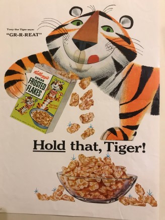 Much of this advertising and promotion was targeted at a general family audience. Ads typically focused on the qualities of the product – convenience and texture (or ‘crispness’) were as vital as taste – but within this, the appeals to adults and children were rather different.[iv] Advertising specifically for adults tended to focus on health benefits, via claims about the importance of protein and fibre. Kellogg’s Corn Flakes, for example, were advertised as fortified with Vitamin D (‘more sun than ever’), while even Rice Krispies were apparently ‘loaded with all the food values of rice’. One 1957 TV ad showed scientists creating ‘Kellogg’s new food discovery’, the apparently protein-rich Special K.