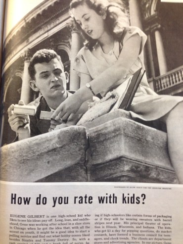 The second book I’ll discuss here, Eugene Gilbert’s Advertising and Marketing to Young People was published almost twenty years after Grumbine, but it echoes many of her arguments and approaches.[xiv] Gilbert famously began his career as an after-school assistant in a shoe store in Illinois: when he proposed ways of researching and then targeting the store’s younger customers more effectively, there was a significant leap in turnover. He quickly formed a youth survey business, employing 300 of his peers to conduct polls at a rate of $3 per day.[xv] An entrepreneurial young man, Gilbert bypassed college and went straight to New York, where he set up his own research and marketing agency: within five years, he was employing 120 ‘field operatives’ in 250 locations, gathering data from 400,000 young people annually. As early as 1950, he had gathered 35 clients ranging from Pepsi-Cola and General Electric to the US army, and his income was reportedly ‘in five figures’[xvi]; by the end of the decade, he was claiming to employ 5000 ‘poll-takers’, and to have completed six million research interviews.[xvii]