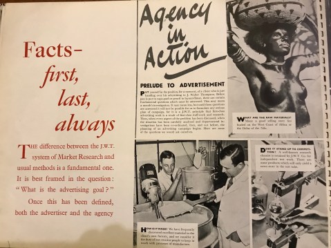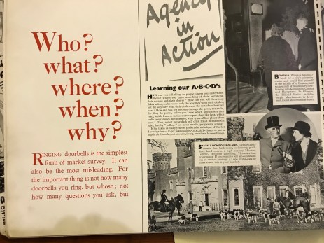As I’ve noted, one key dimension of the expansion of the advertising industry at this time was the growing significance attached to market research. One estimate suggested that there were as many as a thousand market research companies in operation in the United States by the end of the 1960s.[i] A small contemporary flavour of this activity can be found in a glossy book produced by the forward-looking J. Walter Thomson agency, probably in the early 1950s.[ii] Entitled Agency in Action, the book is targeted at potential clients, and seeks to reassure them that the agency’s hefty charge of 15% will offer a good return on their investment. The book contains photoplays illustrating the various stages of the agency’s work, but it places a central emphasis on research. While it acknowledges that ‘advertising is not an exact science’, and that ‘creative genius’ is vital, it emphasizes the need for ‘facts – first, last, always’. ‘Facts, predetermined, are one of advertising’s cheapest and best forms of insurance,’ it proclaims. ‘Properly used, research acts as a stabilizer for creative ideas, sees that they swing neither too far to the right nor too far to the left’. Qualitative research is seen as particularly important in this respect: it enables the agency to develop ‘a personal acquaintance with buyers’. ‘Getting the feel of the public’s pulse’ in this way is more than just a matter of obtaining ‘tabulated replies’; and it is seen as particularly important with ‘class C-D buyers’, or ‘the great mass market’.