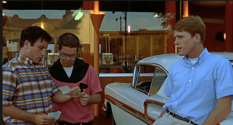 And yet retrospection is a central preoccupation for all of them. Milner, older than the others, is the character who has stayed behind, working as a car mechanic: he talks about ‘remembering the good times’, and looks back nostalgically to what the town used to be like ‘five years ago’. According to him, ‘rock-and-roll has been going downhill since Buddy Holly died’. Although he wins the road race, he knows (despite Toad’s attempts to reassure him) that his days as the coolest guy in town are numbered. Meanwhile, Laurie constantly reminds Steve of the details of their early romance, most of which he seems to have forgotten – effectively tying their past to what she intends will be their future together. As she tells him, ‘it doesn’t make sense to leave a home to find a home’. Curt is perhaps most obviously troubled by this tension between past and future. He wanders the school corridors, trying and failing to get access to his old locker; he has an intimate chat with one of his teachers, who went off to college and quickly came back (‘Maybe I was just scared’, he says); and he briefly takes up with a former girlfriend, recalling the good times. Yet he also has political ambitions (he wants to