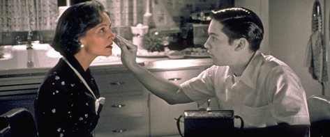There is also an element of role reversal here in terms of age. The adult characters are effectively infantilized, and they find any disruption of the world of Pleasantville profoundly unsettling. When Bill’s working routines at the soda shop are disturbed, Bud has to explain very carefully what he should do; and it is also Bud who inducts him into the world of art. Meanwhile, Mary Sue has to explain to her mother about sex; and when Betty exclaims in horror that ‘your father would never do anything like that’, her daughter also inducts her into the fact that there are ‘other ways to enjoy yourself’. Their father, meanwhile, is utterly helpless once Betty abandons him.