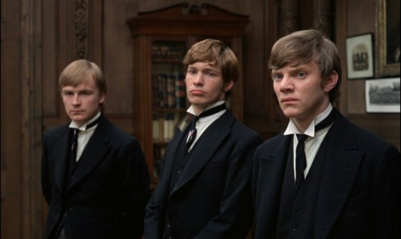 More generally, like many of Anderson’s other films, If…. is replete with references to literature, and to other films. As well as Kipling, there are echoes and lines from Wordsworth, Tennyson, Byron and Blake, as well as scenes that appear to draw on some of Anderson’s favoured film directors, including Ford, Lean and Jennings. (Erik Hedling’s book on Anderson catalogues countless examples of these references.) The choice of hymns sung in the chapel at the opening of several ‘chapters’ is highly pointed. The film is clogged with ‘quotable’, epigrammatic lines and speeches, as well as a great deal of self-conscious symbolism (Mick places a plastic bag over his head, one of the boys watches cells reproducing under a microscope, Denton confiscates Mick’s necklace made of his own teeth). In some respects, the film seems almost to have been designed for pretentious critical explication on the part of film academics – although this was an approach that Anderson predictably condemned in an essay called ‘Critical Betrayal’. At the same time, this dense forest of references might create another kind of distancing or ‘defamiliarisation effect’ – at least for those who are sufficiently well-informed to recognize them. Yet, like some of its characters, the film seems at times to be rather too knowing and clever for its own good.