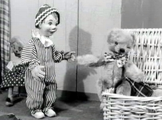 The daily strands of Watch with Mother were diverse in some respects, but there are several shared characteristics. While Rag, Tag and Bobtail generally features a simple fairy tale, and while Picture Book always includes the adult presenter reading a short story from a book, the other programmes are much less concerned with narrative. Each episode of Andy Pandy, The Flower Pot Men and The Woodentops takes us back to the worlds of familiar characters, who are re-introduced in turn, and shown doing the familiar things they invariably do. Andy performs a little dance with his friends Looby Loo and Teddy; Bill and Ben pop up from their flowerpots and then hide when they hear the gardener approaching; the twin Woodentop children do the same actions, both together. Everyday events are repeated in a form of ritual. The pace is extraordinarily slow, there is little movement, and the narrator’s voice is calm and quiet.